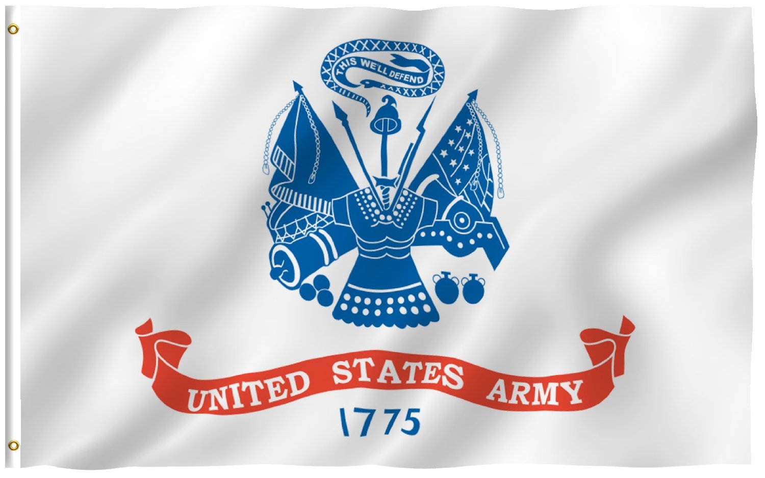 The official Army flag consists of a white field with a blue symbol and red ribbon that reads, “United States Army.” Below that, the year 1775 is written in blue, which denotes the beginning of the Army.